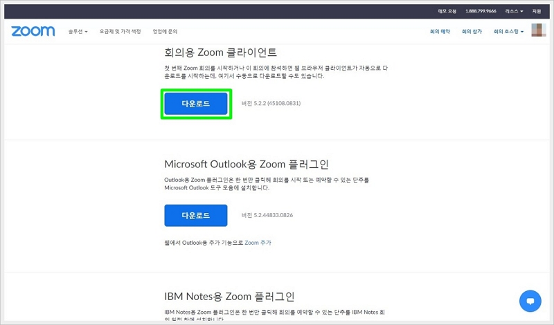 Zoom PC버전은 다양한 서비스로 제공되는데 여기서 가장 안정적인 실행이 가능한 [회의용 Zoom 클라이언트] 설치 파일을 [다운로드] 버튼을 클릭하여 내려받습니다.