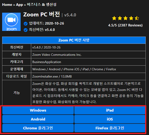 공유드린 링크를 통해 Zoom PC버전 다운로드 페이지로 이동하여 사용중인 PC의 운영체제에 알맞는 ZOOM PC버전 설치 파일을 다운로드합니다.